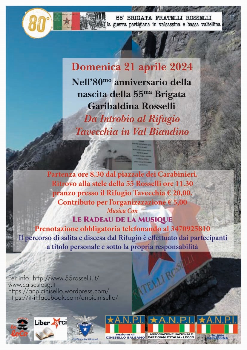 ORGANIZZATORI: Anpi Lecco - Anpi Valsassina (Lc), Anpi Cinisello Balsamo (Mi), Cai Sesto San Giovanni (Mi), Circolo Arci di Osnago (Lc), La.Lo.Co Osnago (Lc), Circolo Liberarci di Barzanò (Lc). Scarica QUI la locandina INFO E PRENOTAZIONI: www.55rosselli.it - cell. 3470925810